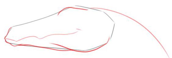 I started with drawing a single diagonal line for the top ridge of the muzzle, then drew a basic line for the front part of the snout(noze and tip of the maw) and then frew the back of its head in.