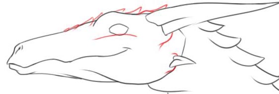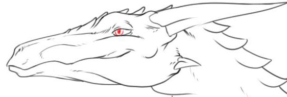 I added a horn on the top of his head and a smaller one from his cheek.. Then the general shape of the eye, his nostril, and added some plates to his neck and drew in the other side of his neck.