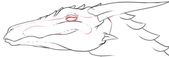 Now here you'll see some blue dotted lines. These are guidelines to help make sure the detailing and defineing lines flow with the structure of his head. The red lines, as always, are the solid lines I end up adding in. These are defining/detailing lines accept the solid lines for the eye opening.